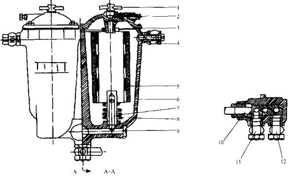 柴油發(fā)電機(jī)組燃油濾清器主要由濾芯、外殼及濾清器座三部分組成,各機(jī)型均通用,唯有溢流閥8有兩種結(jié)構(gòu),根據(jù)不同機(jī)型選用C0810A或C0810B濾清器。12缸V型柴油發(fā)電機(jī)組用C0810A、C0810B各一只并聯(lián)安裝。